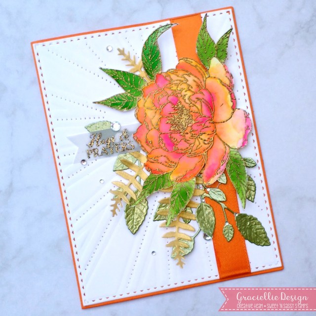 Beautiful card Graciellie. The colors are so bright and cheerful… love the gold heat embossing, the die-cut elements… and oh, that background! Pretty!