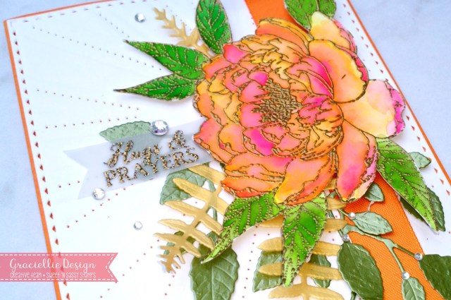 To make the flower look even fuller I added leaf die cuts in olive green and also some ferns in Gold Metallic Vellum. The sentiment was stamped and heat embossed on heavyweight vellum #48 in gold sparkle embossing powder which actually has glitter in it and gives the sentiment a lot of texture.