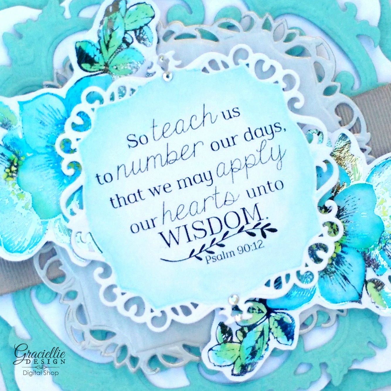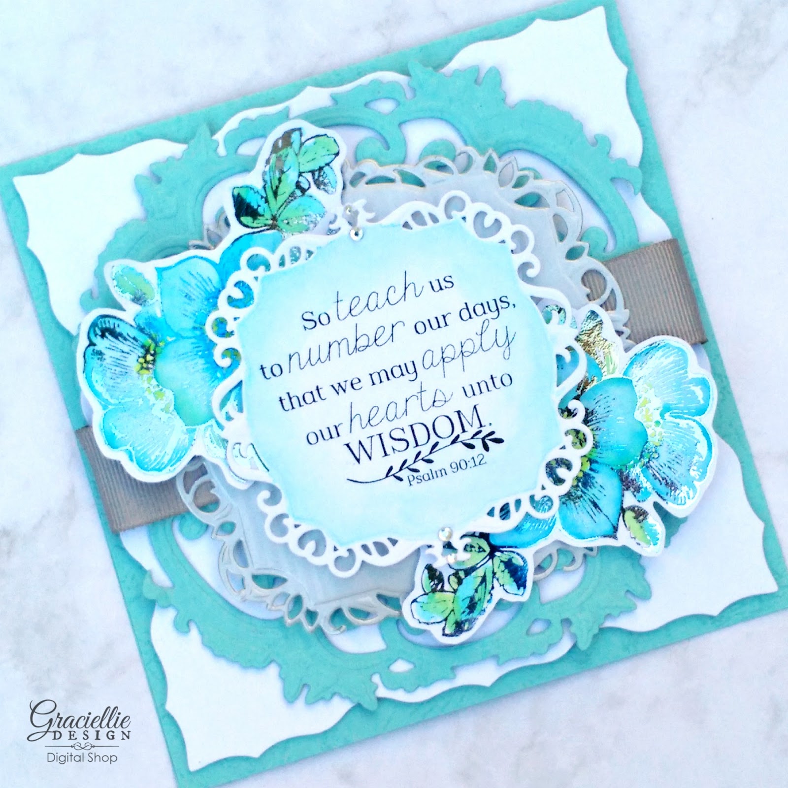 I am joining Word Art Wednesday Challenge today, together with some of Graciellie Design’s Creative Team to showcase their weekly verse printable using our digital stamps. I decided to go for a subtle pool and white card with a touch of gray and Lapis Watercolor Deco Foil.