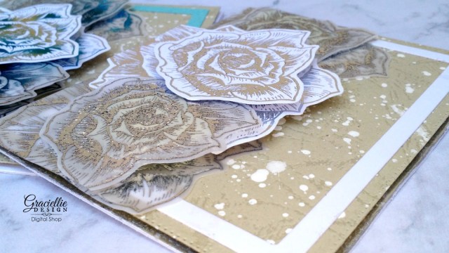 I printed the roses on vellum and white cardstock and then foiled them using Silver and Lapis Watercolor Deco Foil. I painted the back of a couple of vellum flowers with a bit of Antique Linen Distress Paint and found out during the process that any acrylic paint works to create the same effect. The color shows through the vellum and gives the flower a totally different look.