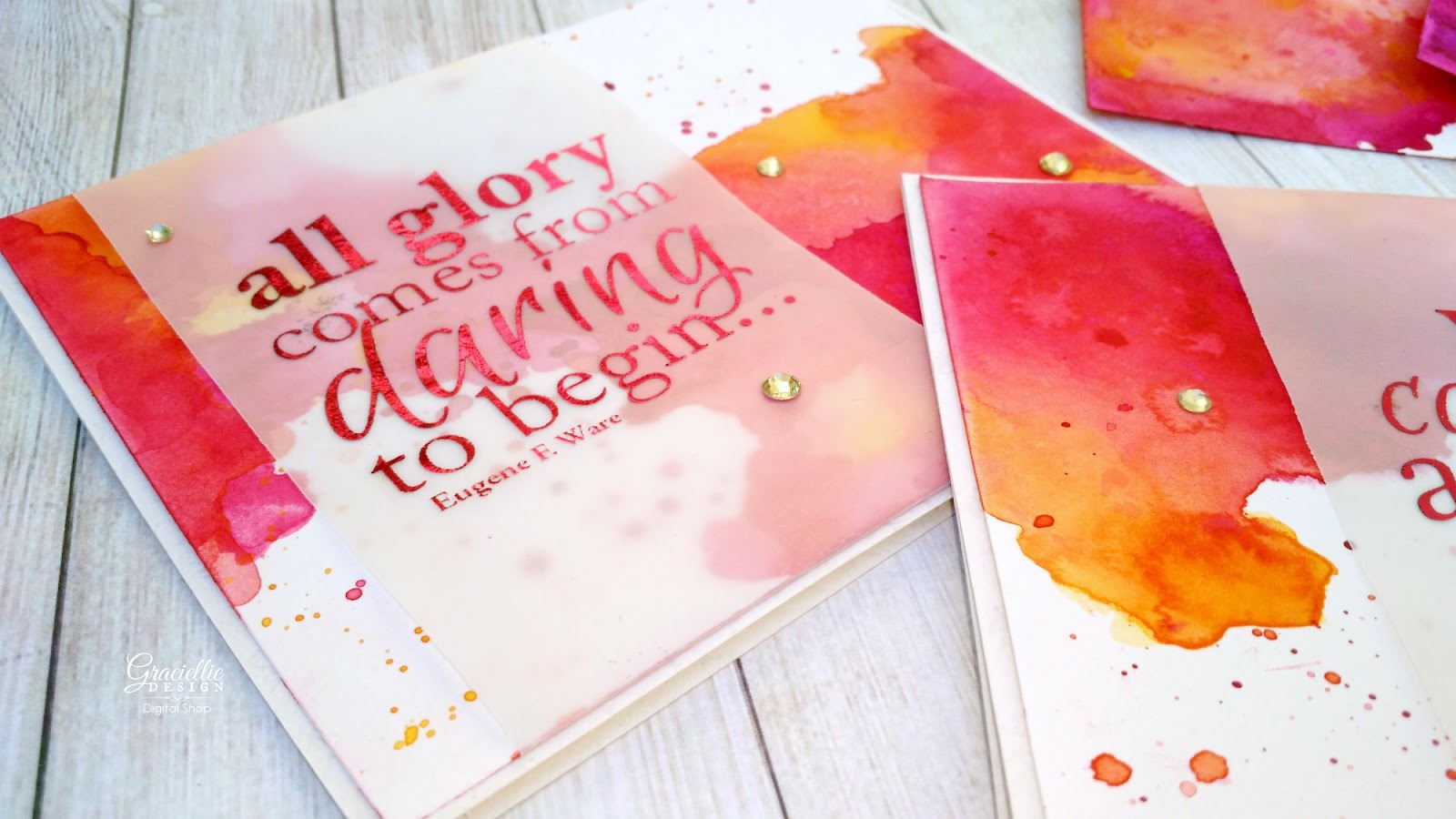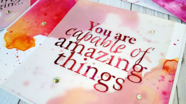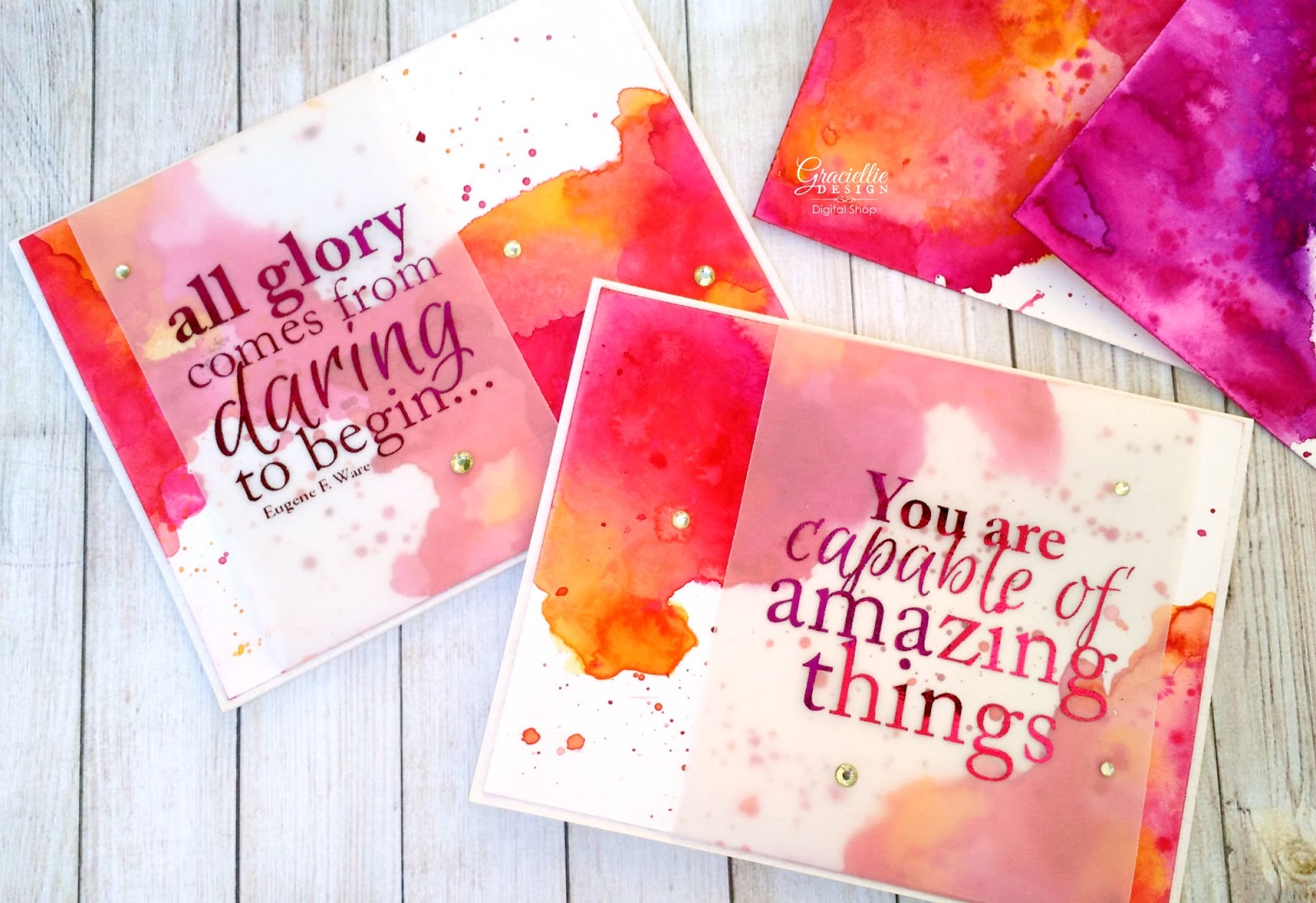 The background I’m painting on the video is based on the ones I used for today’s cards. I got new watercolor colors and I’ve been playing with warmer washes. I love how easy it is to finish a card when you use a watercolor wash… I love adding bold images and sentiments foiled on vellum. These sentiments are actually from my latest digi stamp release on Etsy and I think they look perfect on these backgrounds.