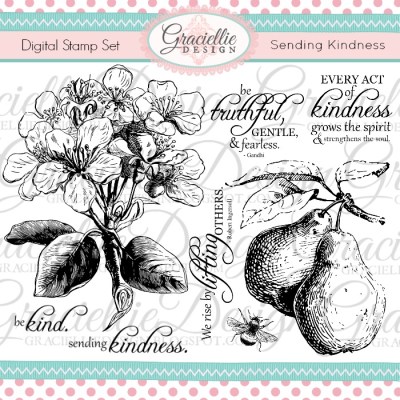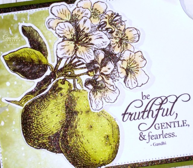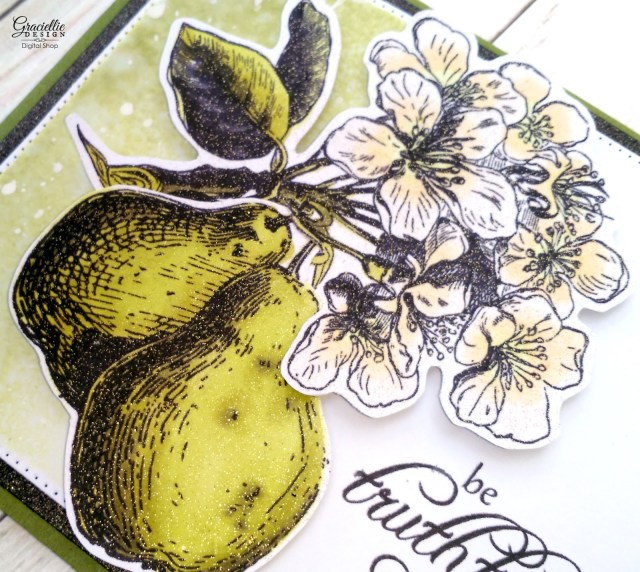 I am using the new set Sending Kindness today. I printed the pear flowers and the pears with a regular inkjet printer (which is the perfect format for alcohol marker coloring). I colored the images with Spectrum Noir Markers and fussy cut them to attach them to the card together as one image. For the background mat I printed the sentiment on one side and then cut it. (You can do this in Microsoft Word easily.) I then sponged one side of the mat with Distress Ink, flickered some water droplets and also some acrylic paint. That created a nice transition and completed the classic look of this card.