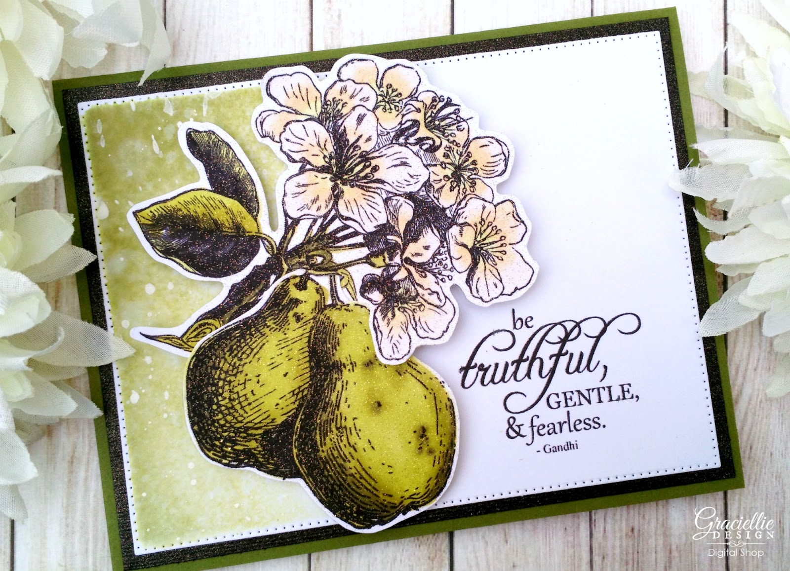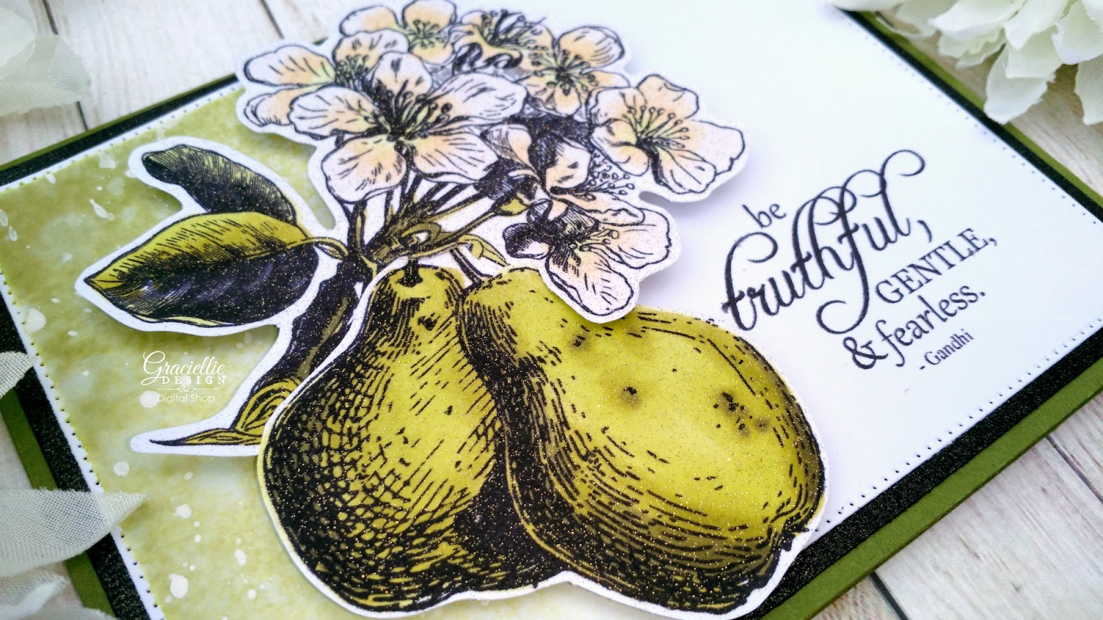 I am using the new set Sending Kindness today. I printed the pear flowers and the pears with a regular inkjet printer (which is the perfect format for alcohol marker coloring). I colored the images with Spectrum Noir Markers and fussy cut them to attach them to the card together as one image. For the background mat I printed the sentiment on one side and then cut it. (You can do this in Microsoft Word easily.) I then sponged one side of the mat with Distress Ink, flickered some water droplets and also some acrylic paint. That created a nice transition and completed the classic look of this card.