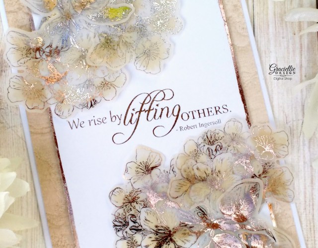 This card could easily become a wedding card, because of the elegant foiled finishes. Adding deco foil to my digital stamps has been one of my favorite techniques since day one. I printed the flowers in laser and foiled them with different tones of gold deco foil: Champagne, Rose Gold and Amber Watercolor. I also added a rustic foiled touch to the edges of the sentiment frame using a Tape Runner XL. Of course I did print and foiled the sentiment too and added it on a lace textured patterned paper from DCWV. To add a coordinating finish to the vellum flowers I colored them from the back with a matching beige alcohol marker. (That always makes a difference!)