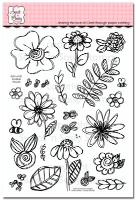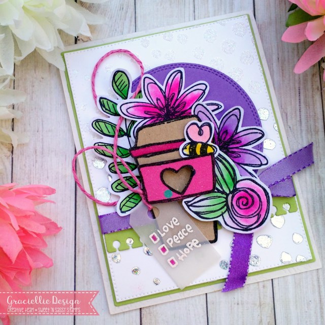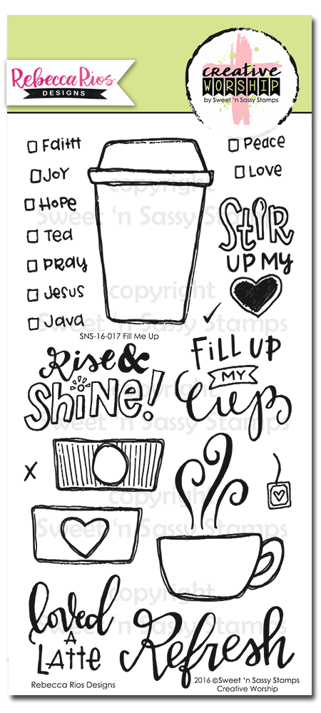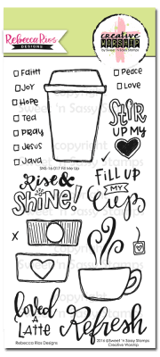 Today I’m using what I think is the cutest coffe cup clear stamp there is to make a freestyle collage card! I’m featuring stamps from the sets Fill Me Up and Scribble Flowers by Sweet ‘n Sassy Stamps!