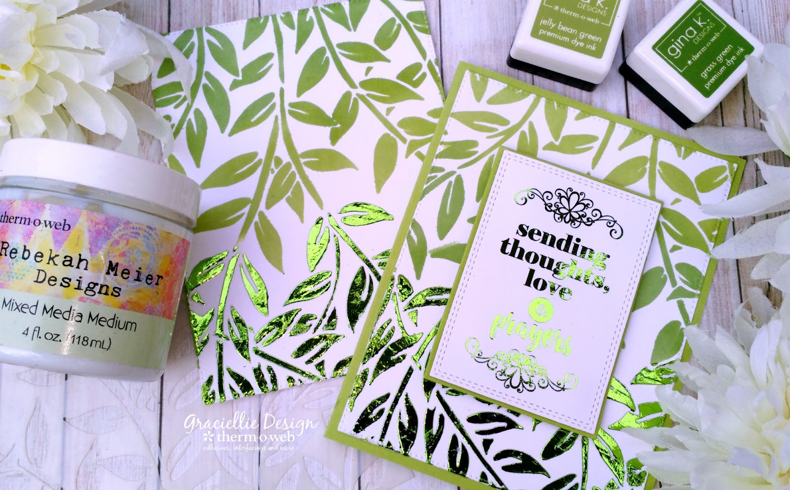 Click here to check out my latest video tutorial for Therm O Web – and the complete list of supplies- featuring these foil dipped backgrounds with Mixed Media Medium and Fancy Foils!