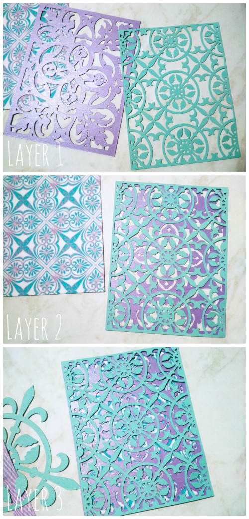 Layer 2. I also cut a Anna Griffin Flourish Cards and Embellishments card base sized to an A2. I did cut the back of the flourish card to create a matching layer for the medallion panel. Although the designs are different both of the panels match to perfection and you can see a hint of the flourish design under the medallion panel for a modern layered die cut look that is so on trend right now!