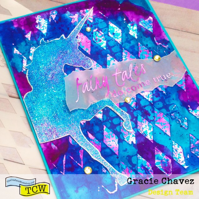 Check out the complete step by step tutorial on The Crafter’s Workshop blog. Leave me a comment on TCW blog letting me know what you favorite texture or element on this card is. Do you love the watercolors? The foiled effect? The glitter on the magical unicorn?