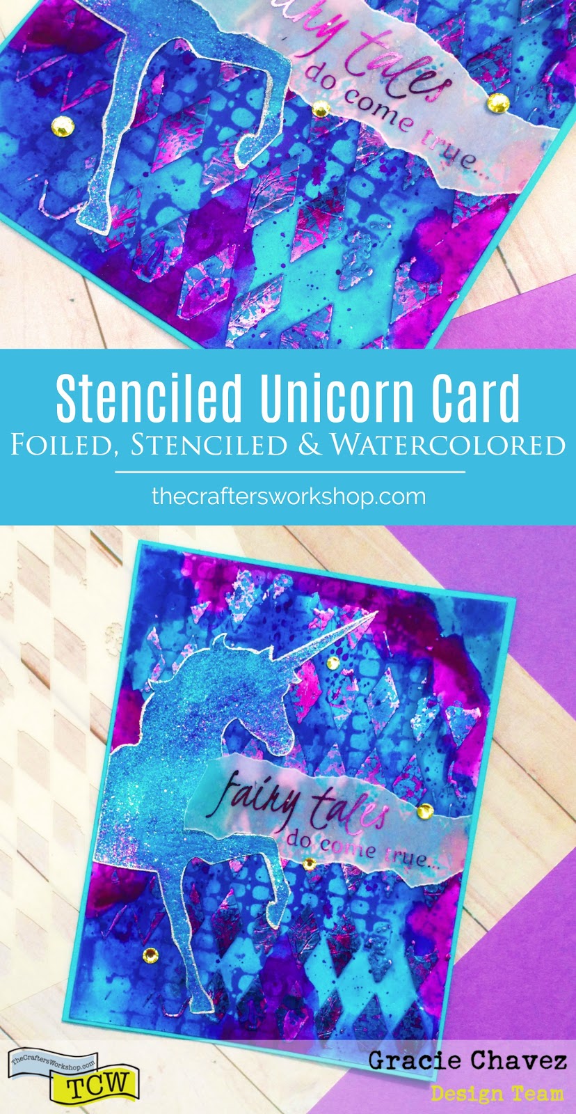 I’m sharing a magical tutorial today with The Crafter’s Workshop. A unicorn stenciled and foiled card with lots of color and sparkle. I love stencils and the depth they add to projects and today you’ll see how only one stencil gives you so much interest.