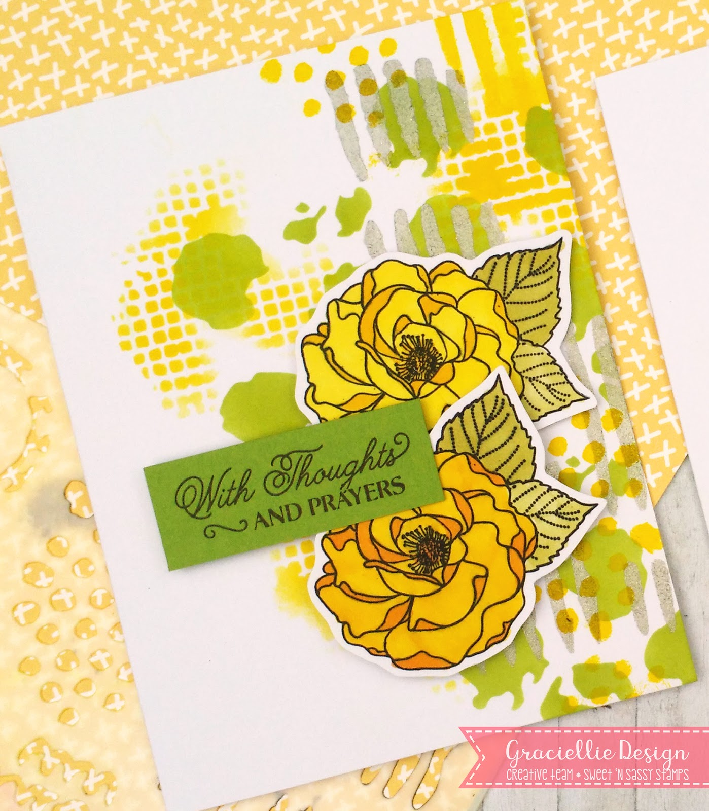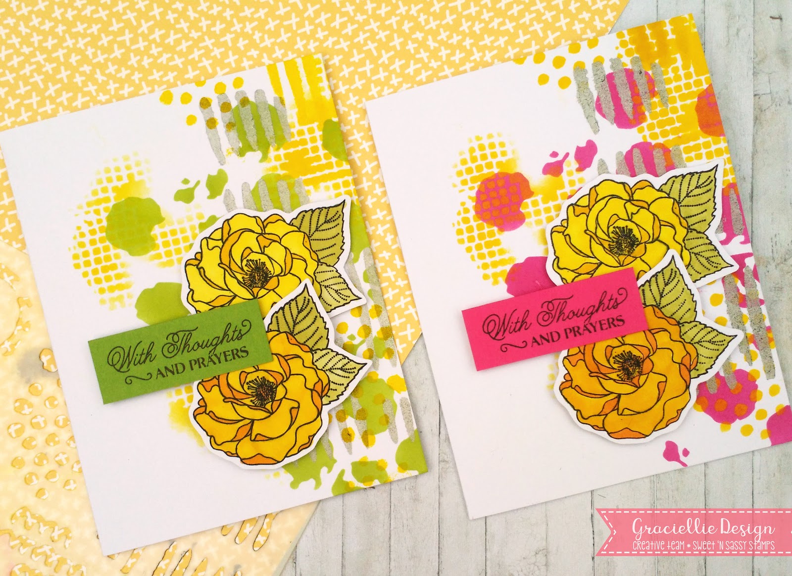 I started out by picking my color palette. I wanted to go for a bright and unique color combo and that is how my first card came to life in yellow and green. I stenciled the backgrounds with a TCW Distressed Details stencil using mostly ink. I did stencil a few patterns with TCW heavy body acrylic paint in yellow and silver metallic.