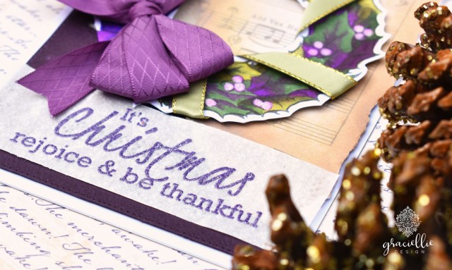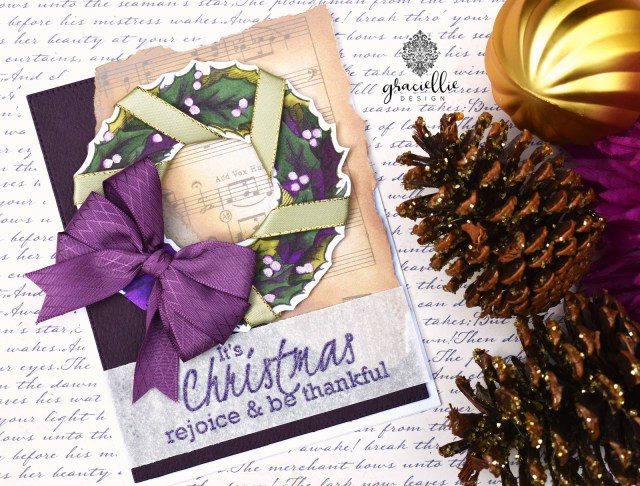 This stamp set is called Cheery Christmas and you can find it in digital format here. Of course, we have made these images available also as a rubber stamp kit at Unity Stamp Company (which is so detailed). I decided to use the digital version of this stamp set for this card. I sized the Christmas wreath and sentiment to fit the entire front of my card. I colored the wreath with Spectrum Noir markers blending a deep purple color with dark green and then adding highlights with a lighter green to a few sections. To make the image pop I added light green ribbon around the wreath and then made a triple bow with this lovely textured purple ribbon, which I attached to the bottom of the wreath image. I made the bow by hand. You can find tutorials on YouTube in case you want to try it out… It’s not hard at all! I adhered the wreath on an Eggplant card panel that I also layered with a piece of patterned from the new Holiday Traditions Digital Paper Pack.