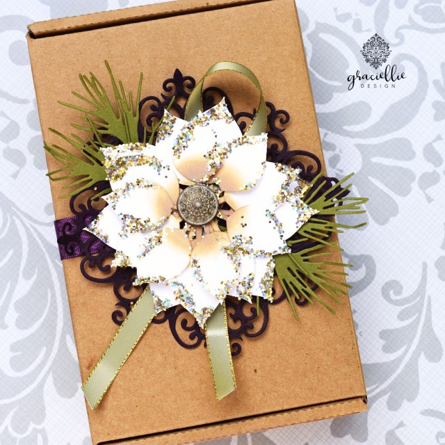 Once my card was ready, I came across this box my husband left in the living room. I usually store all those pretty boxes from packaging and although this one wasn’t the prettiest I’ve seen it happened to match the vintage patterned paper on this card… (Potential my crafty friends… All of us -I’m sure- have an eye for potential…) I started embellishing the box with die cuts and ribbon to match the card. I needed a bold accent and it needed to be large to go across the front of the box. Not even the largest poinsettia dies I own were large enough and so I went for a dive online and found this gorgeous poinsettia SVG… You gotta love the freedom of resizing stuff to fit your projects! I get lots of satisfaction on being able to size images and cutting files for projects such as this one.