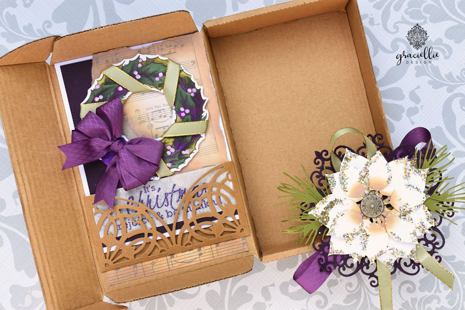 This idea started off with this card. This is -I believe- my first purple Christmas card ever and I find the color combination to be so elegant. I used beautiful papers from Paper Temptress and stunning ribbon from Really Reasonable Ribbon. I’m also featuring stamps and papers from my new Holiday collection.