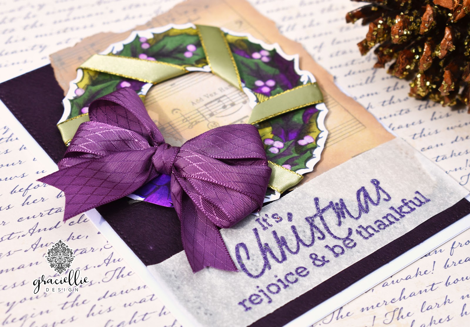This stamp set is called Cheery Christmas and you can find it in digital format here. Of course, we have made these images available also as a rubber stamp kit at Unity Stamp Company (which is so detailed). I decided to use the digital version of this stamp set for this card. I sized the Christmas wreath and sentiment to fit the entire front of my card. I colored the wreath with Spectrum Noir markers blending a deep purple color with dark green and then adding highlights with a lighter green to a few sections. To make the image pop I added light green ribbon around the wreath and then made a triple bow with this lovely textured purple ribbon, which I attached to the bottom of the wreath image. I made the bow by hand. You can find tutorials on YouTube in case you want to try it out… It’s not hard at all! I adhered the wreath on an Eggplant card panel that I also layered with a piece of patterned from the new Holiday Traditions Digital Paper Pack.