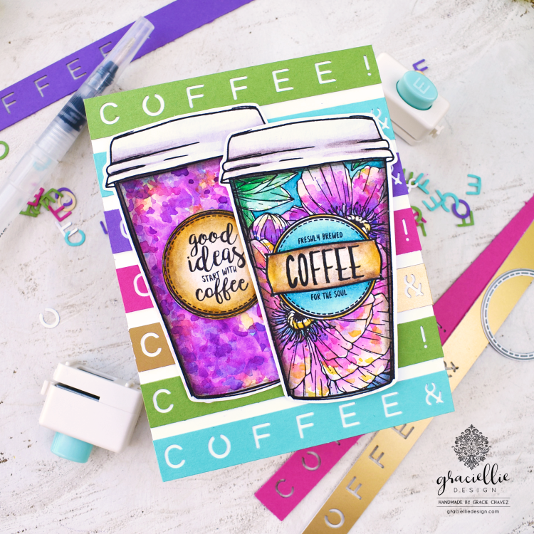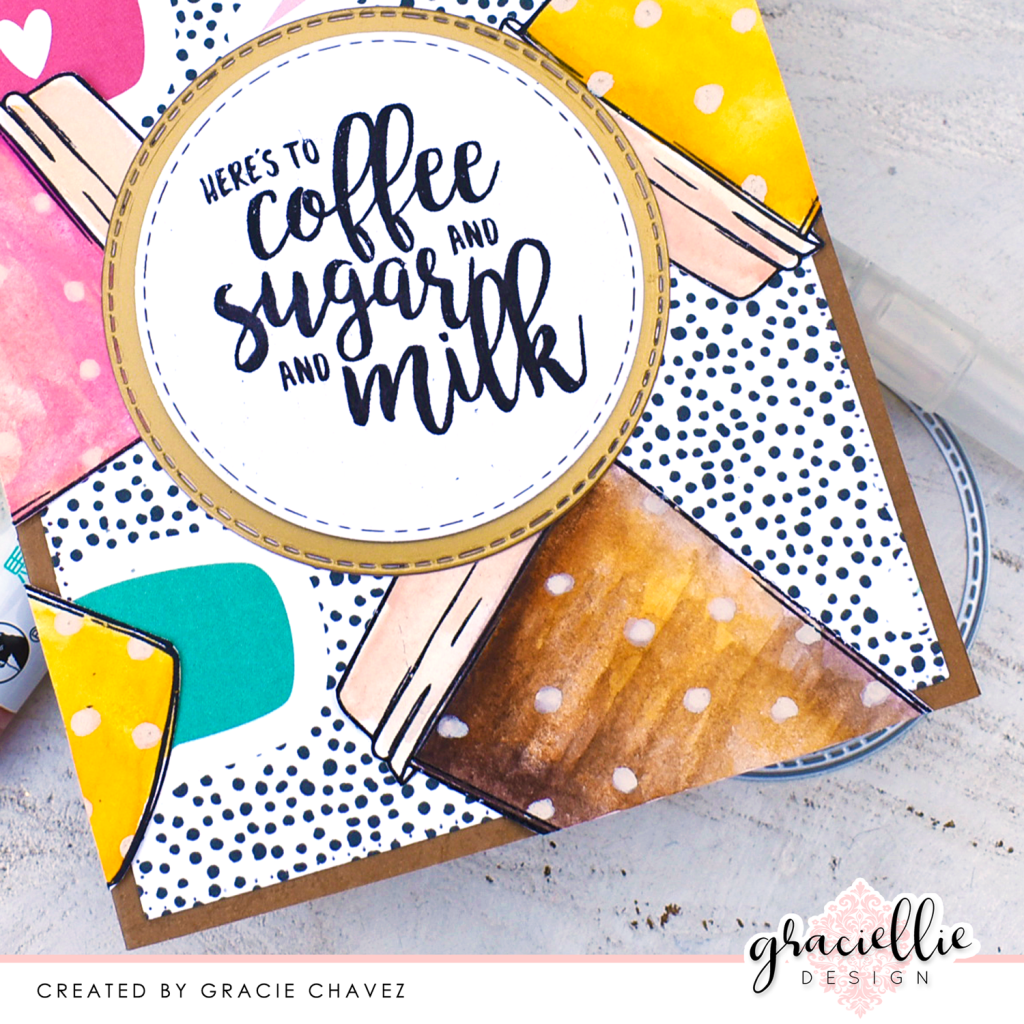 We haven’t stopped sharing caffeinated inspiration over at Instagram & Facebook. In fact, we went live yesterday to share a bit more on the gouache technique I used on my card for the hop (See HERE). We shared a few useful tips and painted a couple of coffee cups live… Fun times… (Watch the replay HERE.) Anywho, today’s card was made with one of the coffee cups colored in the live video plus a couple more I painted later that afternoon!