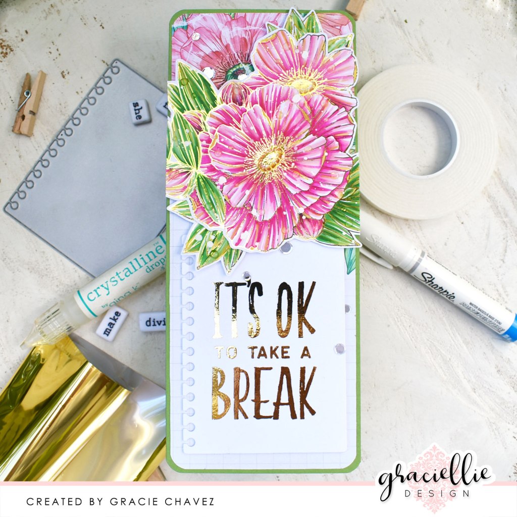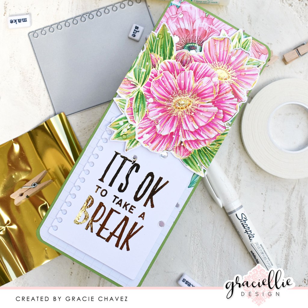 For the sentiment I decided to go for this sweet “It’s ok to take a break” phrase which was also printed in toner and foiled with Gold Deco Foil. I used a discontinued MFT Die-namics mini notebook page die to cut it and attached it to the bottom of the slim card using Foam Adhesive Sheets, which adds just the perfect amount of dimension. The sentiment, florals and background are at different levels balancing each other on the final card design. And because there can never be enough bling and shimmer I finished off the card with a few iridescent sequins I attached using Ultra Bond Liquid Adhesive! Oh, and of course I ended up rounding all 4 corners of the slim card with a corner punch.