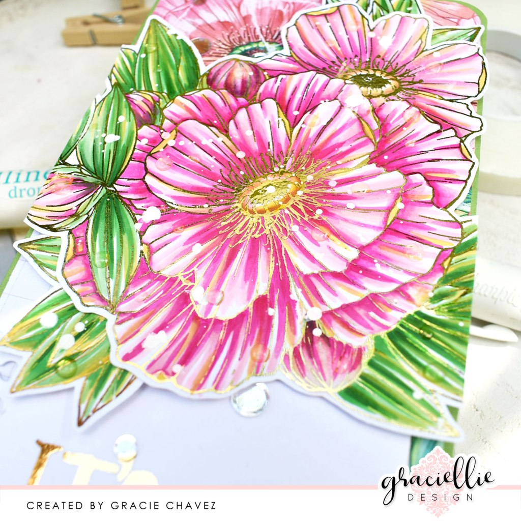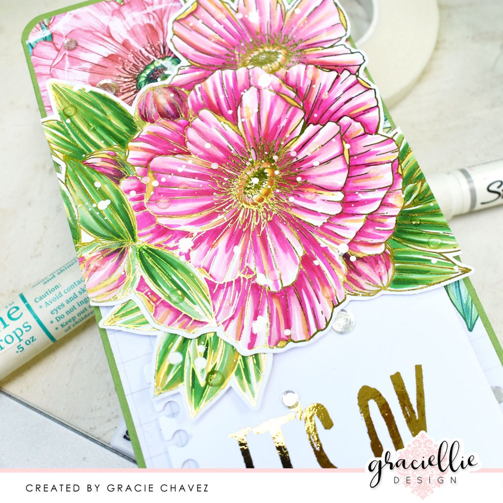 I used Spectrum Noir alcohol markers to color this hand illustrated digi. I used MG3, PP3, PP2, PP1 for the flower and AG1. AG2, AG3, AG4 for the leaves. I also used GY1 for the dark yellow accents. I used clean strokes to add shadows to the petals and leaves trying not to blend the darkest hue all the way and keeping a few areas white or nearly white to add light to the coloring. By the way, the Deco Foil won’t damage your marker tip if it’s been foiled and transferred on toner. In fact it acts as a resist when using watercoloring or other water activating media. If you notice that you’ve stained the foil color with during your coloring simply use a cotton swab and a bit of alcohol to clean off any staining. To finish off the flowers I used a Sharpie acrylic paint marker to add white splatters and added some Crystalline Drops to the petals and leaves.