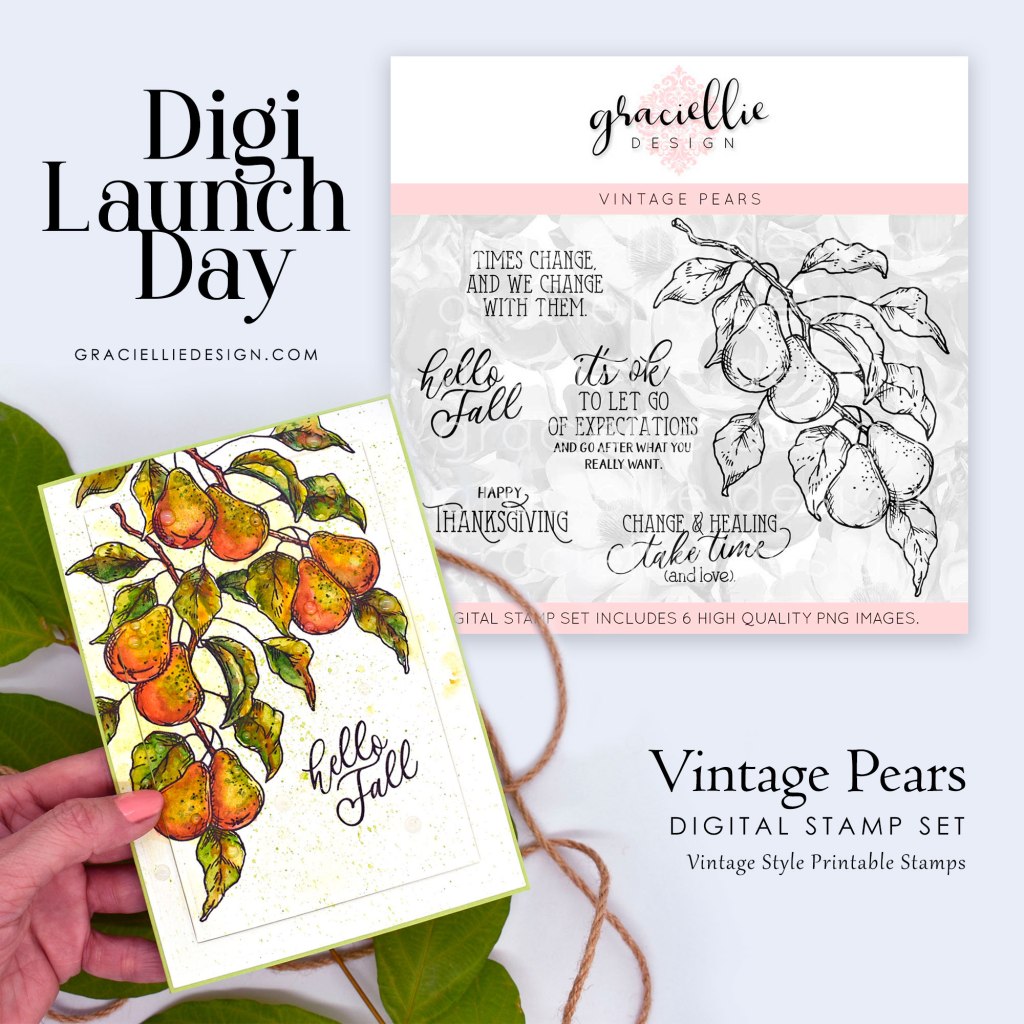 Nothing says Autumn in the crafty world like earthy colors! I grabbed my go to watercolor palette and brought to life our new Vintage Pears Digital Stamp Set to make a 5″x 7″ card. This printable set comes with a vintage style pear branch, handdrawn by yours truly. By the way, a plain illustration just wasn’t doing it for us, so we had to go back and add engraved details by hand. Watercoloring these pears is a treat! When coloring fruit is always fun to play with different hues, highlights and shadows and even dimension.