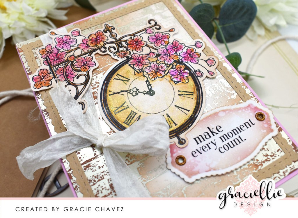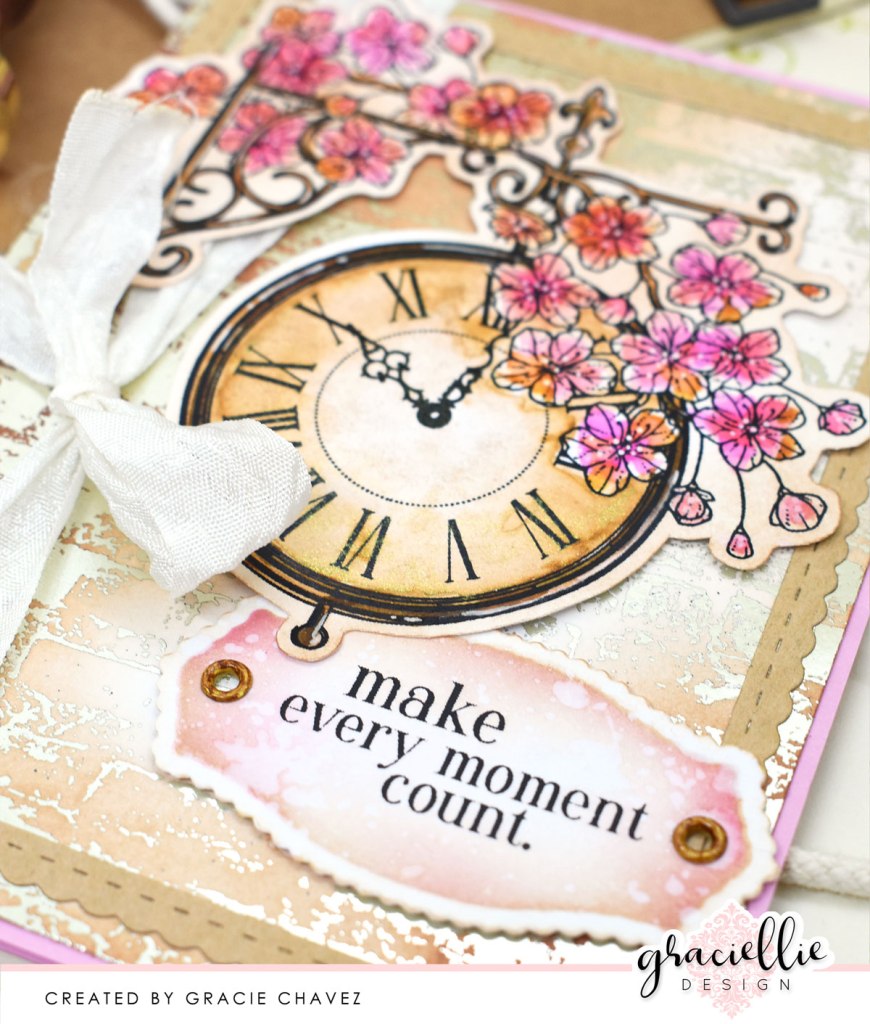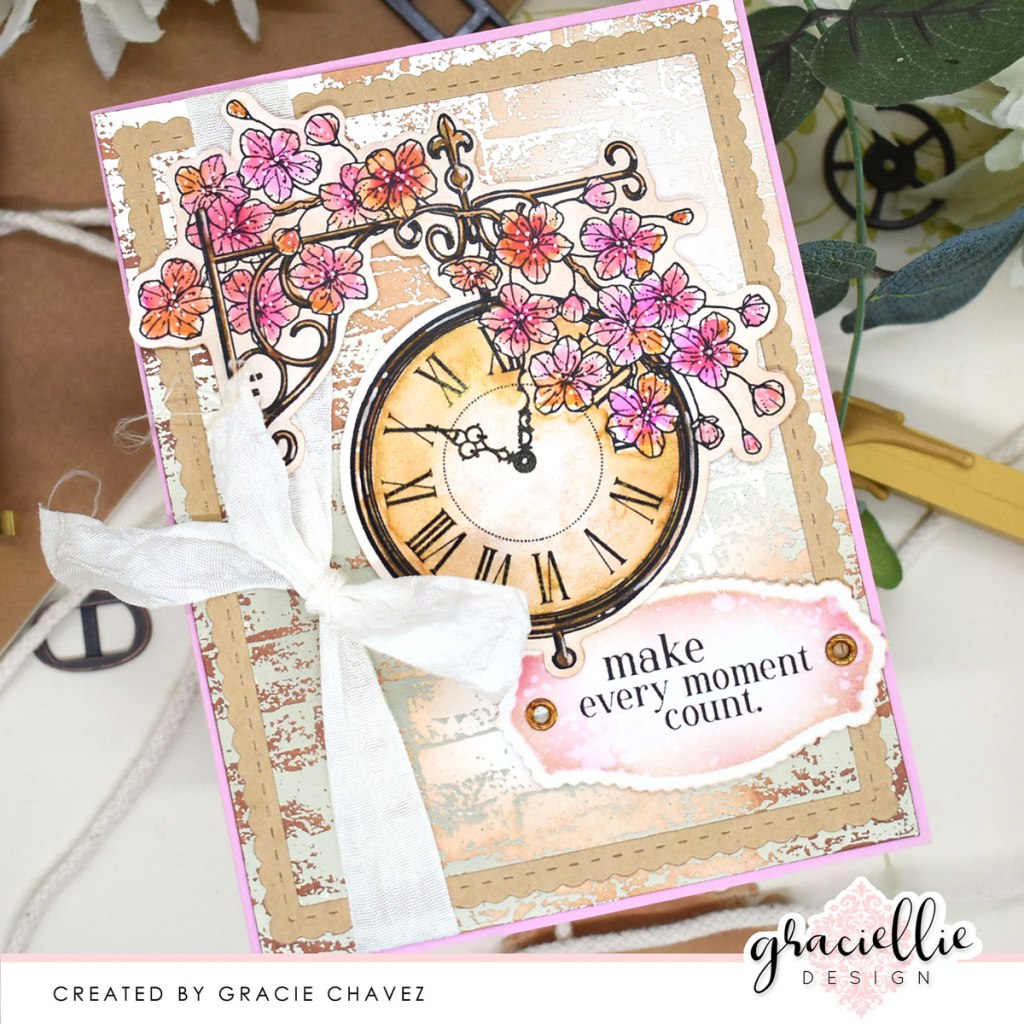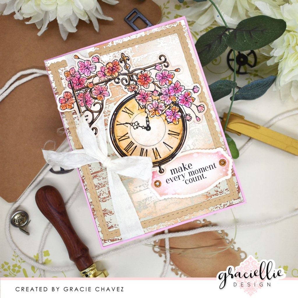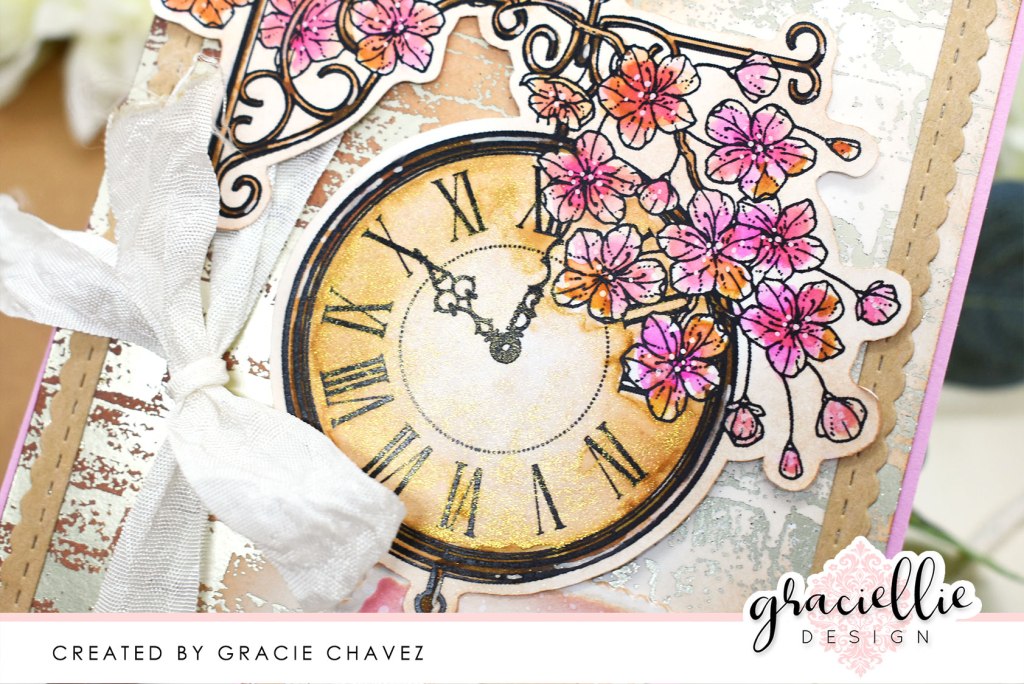 I used a laser printer for every image used on today’s card. The toner allowed me to foil the new Rustic Brick Background with Therm O Web’s Mixed Media Transfer Foil in the color Antique Pearl. Then I partially inked the background with Vintage Photo Distress Ink. I used the leftover ink on the brush to distress the outline of the fussy cut floral clock and even the sentiment label. Click below to watch a timelapse of the cardmaking process: